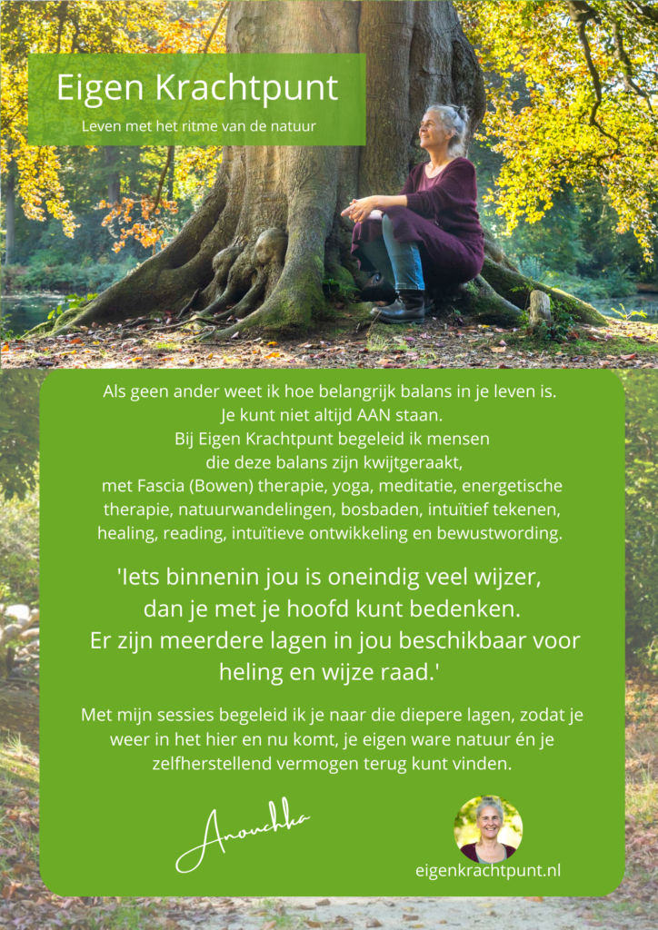 Als geen ander weet ik hoe belangrijk balans in je leven is. Je kunt niet altijd AAN staan. Bij Eigen Krachtpunt begeleid ik mensen die deze balans zijn kwijtgeraakt. Naast coaching, yoga, manuele- en energetische therapie is natuur een belangrijk Continue reading →